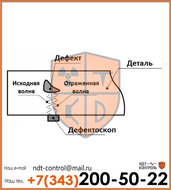 Когда волны «натыкаются» на раковины, тещины или пустоты, происходит их отражение от стенок данных дефектов, а значит и отклонение от основного направления потока. Изменение движения волн выводится на монитор УЗК прибора. Далее, в зависимости от полученных характеристик, оператор определяет вид дефекта, размер и расстояние до дефекта.